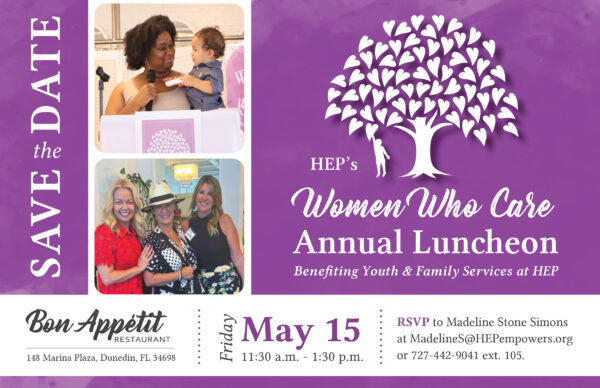 Mark your calendar for this year’s Women Who Care Luncheon scheduled for Friday, May, 15th at Bon Appetit’ Restaurant in Downtown Dunedin where guests gather for a delicious lunch to hear first-hand from a special guest speaker about how your WWC funds are making a difference in the lives of children and families at HEP.